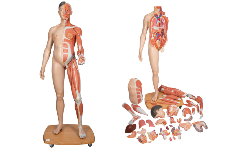 • 실측 크기의 양성(Dual-sex) 인체 전신 해부학 모형 • 인체의 다양한 부위를 분리 가능한 전신 모형 • 모델 오른쪽은 피부를 보여주며, 왼쪽은 근육, 신경, 혈관, 뼈를 보여줌. • 다음과 같은 구성품 - 2분리 머리 - 뇌 반쪽 - 흉쇄유골근 - 6분리 팔(삼각근, 이두근, 삼두근, 요골굴근, 요골신근, 박요골근) - 5분리 다리 상부(봉공근, 대둔근, 대퇴직근, 대퇴이두근, 반건양근) - 2분리 다리 하부(비장근) - 가슴,복벽,유선 표시 - 팔, 다리가 있는 상반신 - 폐, 심장, 방광, 담즙, 간, 위장, 신장, 소장 - 여성성기, 남성성기 | |