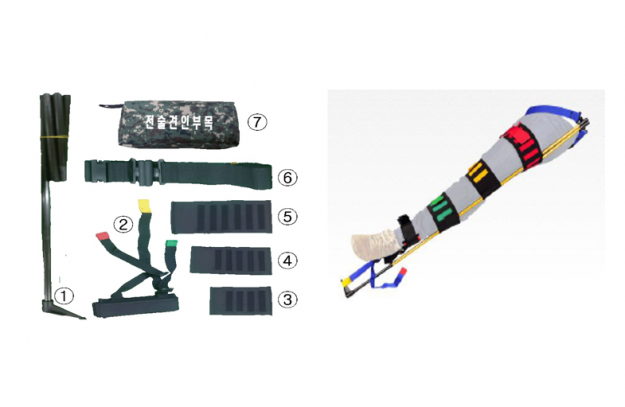 -폴대는 7단으로 구성되어 있으며 조립 시 일체형으로 연결되며 필요에 따라 길이를 조절하여 사용가능하여야 한다 -폴대 끝부분에는 발목끈을 걸 수 있도록 “L”자 모양의 걸림 부분이 있어야 한다 -5가지의 고정끈으로 구성되어 있어야 한다 -허벅지, 무릎, 발목용 고정끈은 벨크로를 이용하여 탈부착이 가능하여야 한다 -허벅지 상단부 고정끈에는 폴대의 끝부분을 끼울 수 있도록 두 개의 홈이 있어 폴대를 견고하게 고정하여 견인할 수 있어야 한다 | |